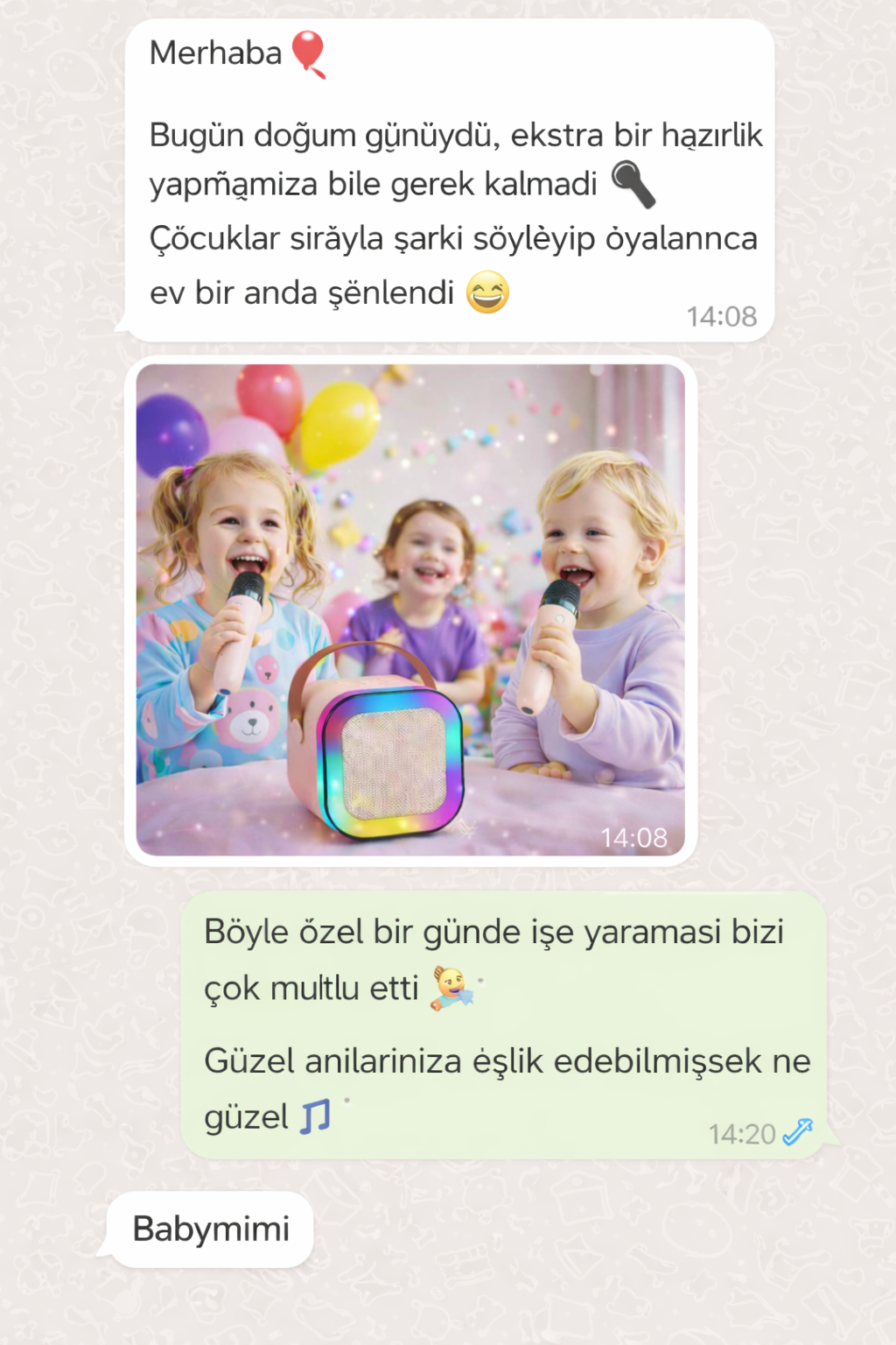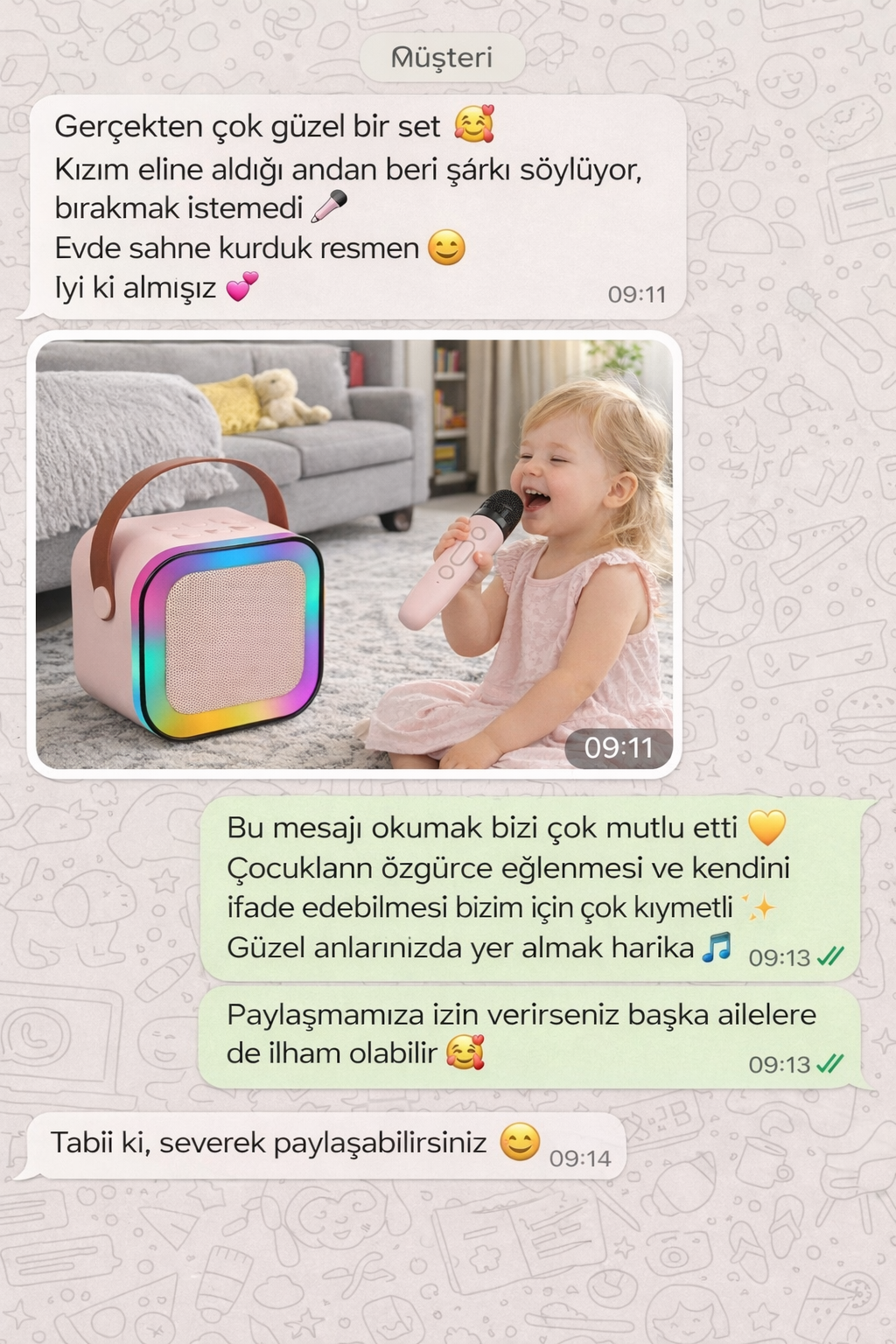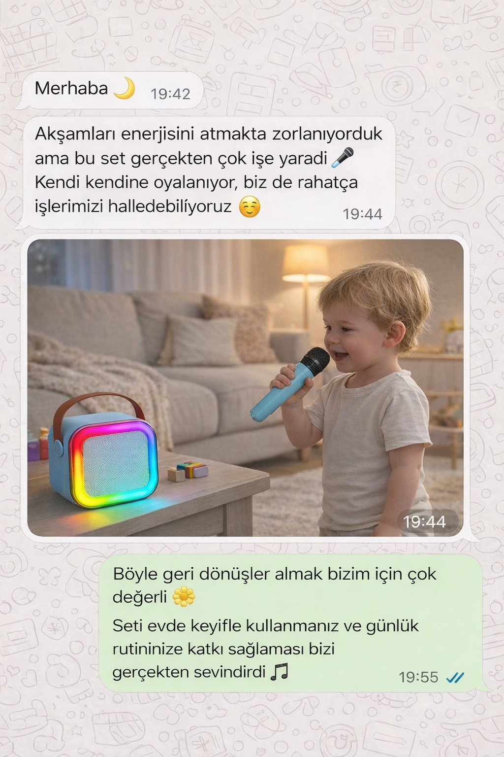 Tek başına eğlencenin çok ötesinde, bu karaoke seti ailece bir araya gelmeyi teşvik eden özel anlar yaratır. Anne, baba ve çocukların aynı sahnede şarkı söylemesi; kahkahalarla geçen, bağları güçlendiren ve unutulmaz hatıralara dönüşen keyifli zamanlar sunar. Ekran süresini azaltırken, birlikte üretmenin ve paylaşmanın mutluluğunu hissettirir.