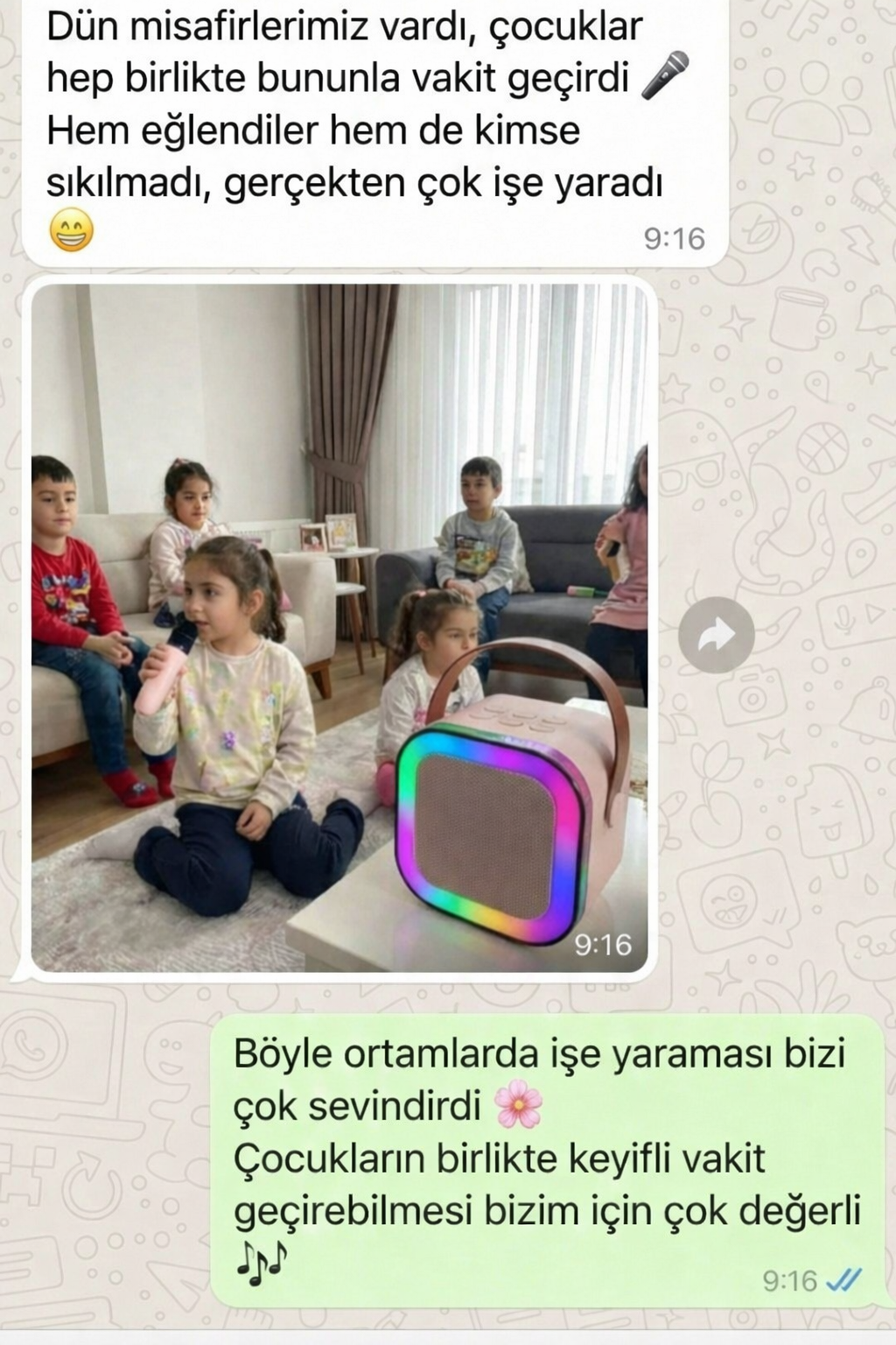 Karaoke artık sadece sahnede değil, evinizde, bahçenizde, hatta tatilde bile! Renk değiştiren LED ışıkları ve güçlü ses performansıyla bu Bluetooth hoparlör, her ortamı anında parti havasına sokar. Kablosuz bağlantı sayesinde telefon, tablet veya bilgisayar fark etmeden kolayca bağlanır, birkaç saniye içinde müzikle dolu bir atmosfer oluşturur.